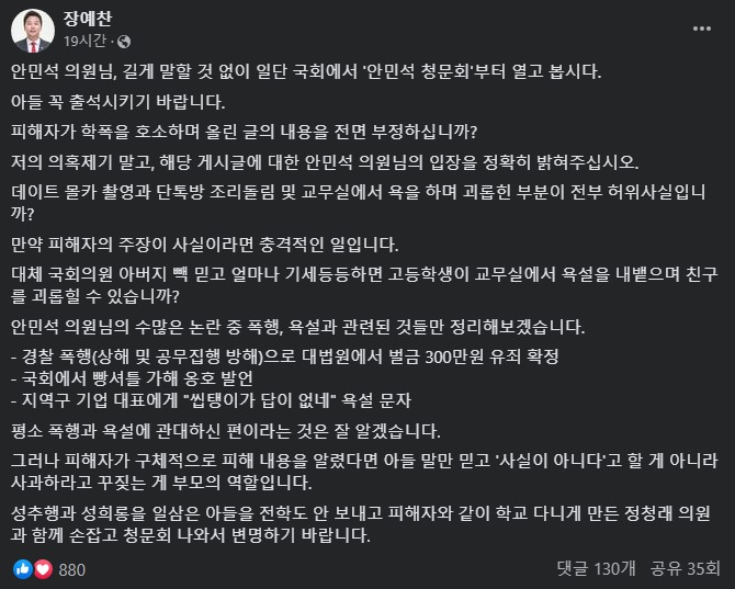 이러한 학폭의혹을 제기하며 장예찬 청년최고위원은 "사실 여부에 대해 안 의원이 책임 있는 답변을 해주기를 바란다"고 말하며 "국민의힘 당정협의회에서 밝힌 학폭대책위가 현실화한다면 여중생을 성추행하고 지속해 성희롱하고도 전학조차 가지 않은 민주당 정청래 의원의 아들, 그리고 안 의원의 아들은 대입에도, 취업에도 분명한 불이익을 받게 될 것"이라고 밝히며 깔끔하게 안민석 청문회를 열어보자고 주장하고 있습니다.