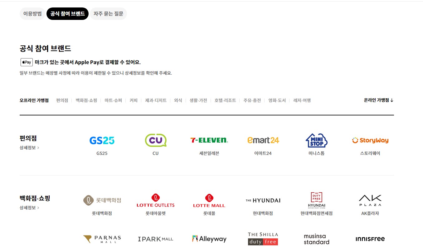 반면 주요 프랜차이즈, 대형마트, 편의점 등에서 NFC 단말기를 보유하고 있어 애플페이 결제를 이용할 수 있습니다. 상세한 애플페이 사용처는 위의 링크를 통해 바로 확인하실 수 있습니다.