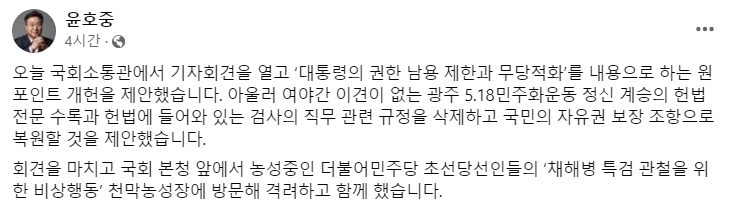 더불어민주당 윤호중 의원은 제22대 국회의 시작과 함께 대통령의 권한을 제한하고 탈당을 통한 정치적 중립성을 확립하기 위한 '원 포인트 개헌'을 강력히 제안했습니다.