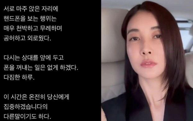 이어 “다시는 상대를 앞에 두고 폰을 꺼내는 일은 없게 하겠다. 오늘은 ‘이 시간은 온전히 당신에게 집중하겠습니다’라고 다짐하는 하루였다”라는 다짐을 덧붙이며 자신만의 원칙을 세웠음을 드러냈습니다.